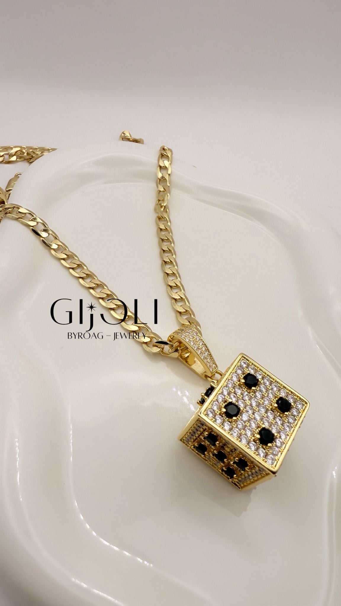 Un dado de oro con detalles en piedras negras y blancas, símbolo de suerte y estilo.