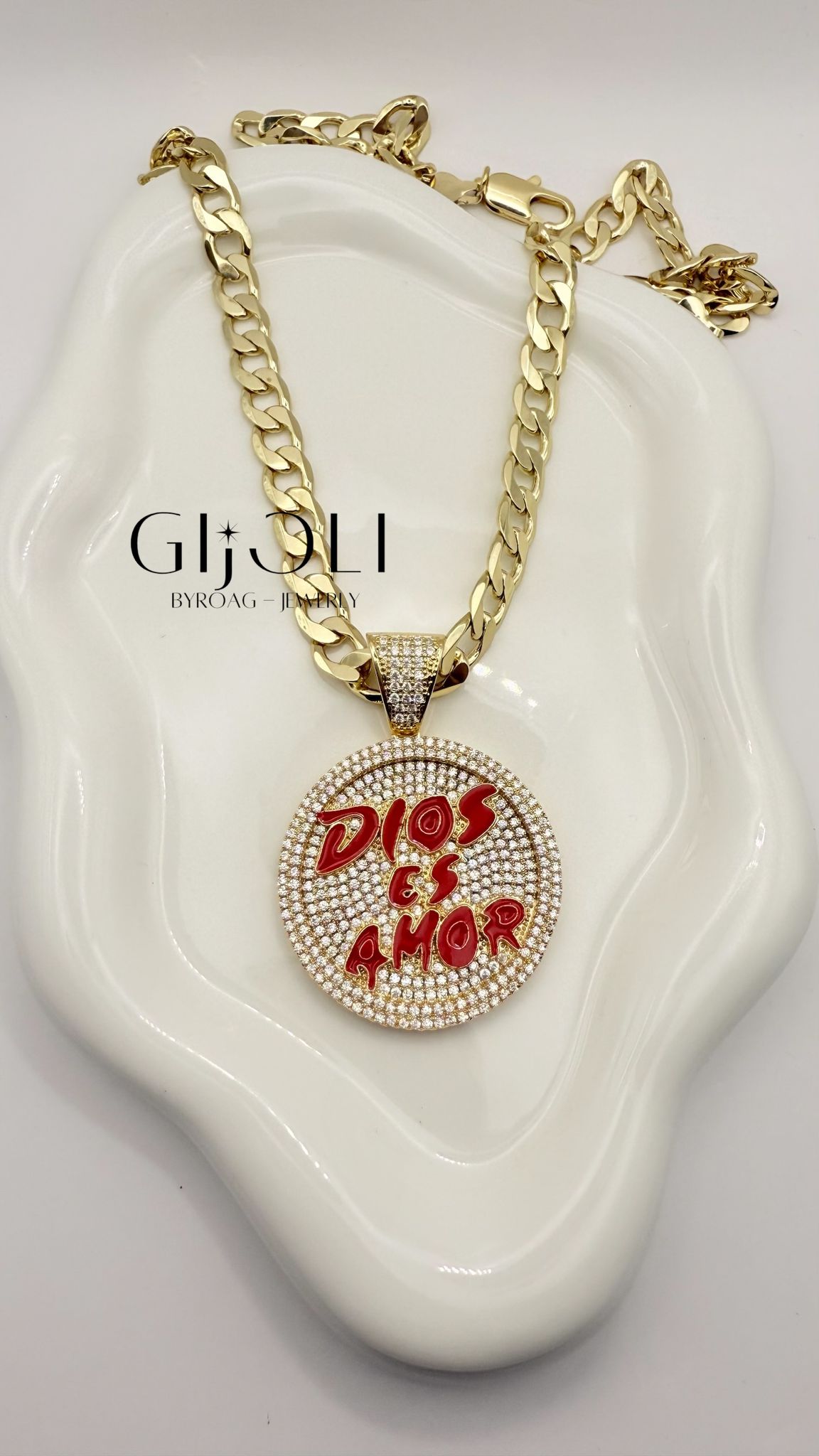 Este hermoso dije circular, bañado en tono dorado y decorado con brillantes, lleva grabado el poderoso mensaje: “Dios es Amor” en un impactante color rojo. Es más que una joya: es una declaración de fe, esperanza y amor divino.