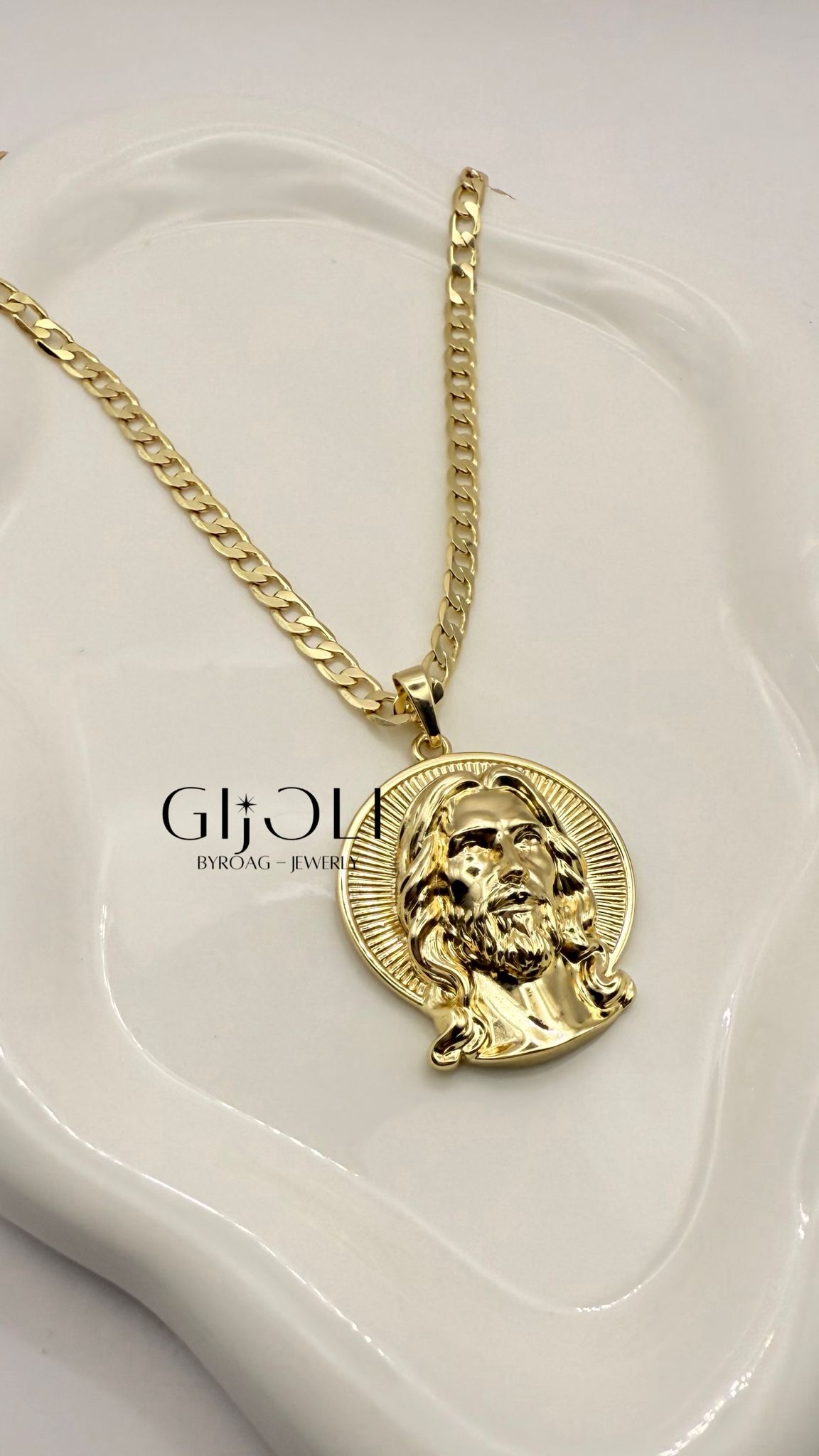 Un colgante dorado que representa el rostro sereno de Jesús, rodeado de un halo de luz que simboliza protección, fe y guía espiritual.