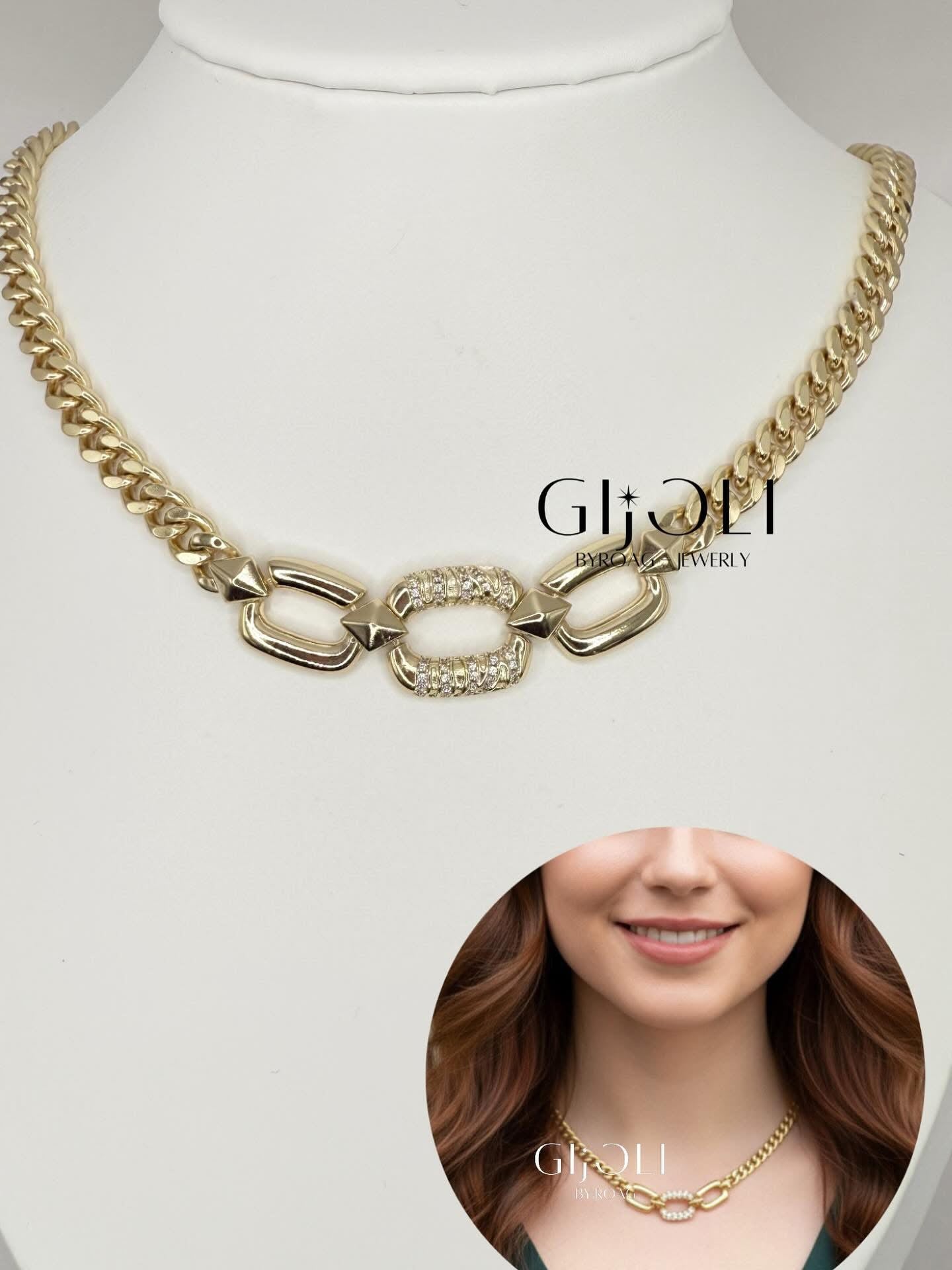 La cadena lateral es un estilo "Cubana", y el centro tiene eslabones decorativos grandes, uno de ellos con brillantes.