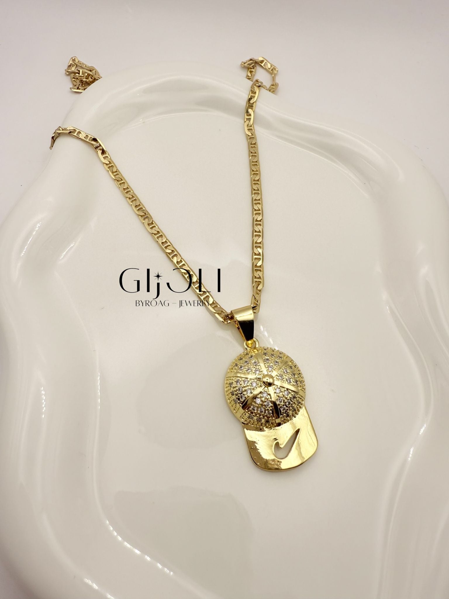 Cadena con dije en forma de gorra deportiva decorada con brillantes que realzan su diseño moderno y urbano.