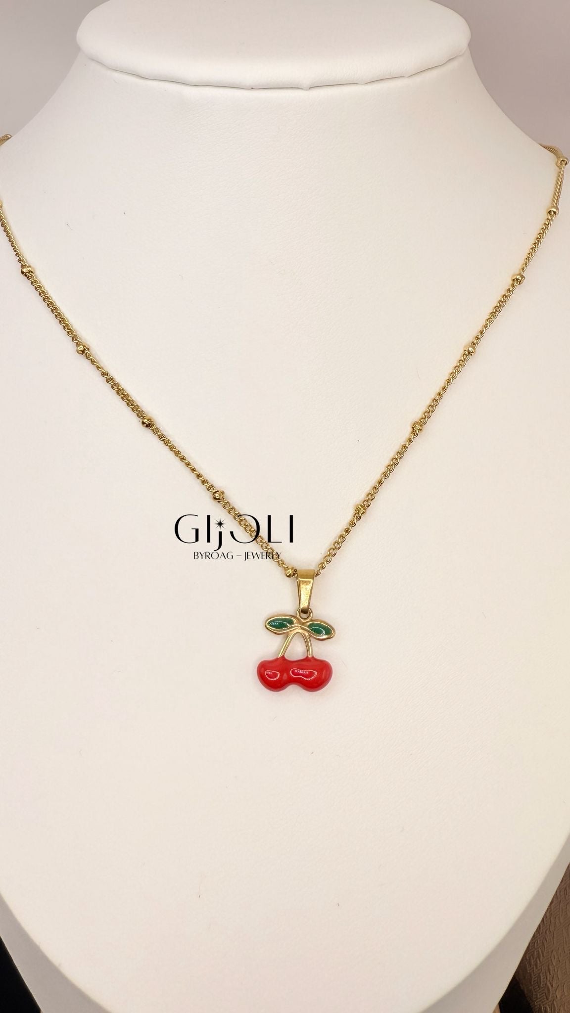 Cadena dorada de bolitas y colgante de cerezas esmaltadas. Un accesorio lleno de vida y color para sonreír. ¡Consigue la tuya!