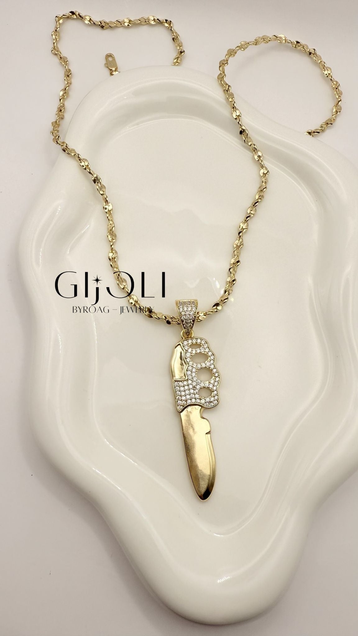 Cadena con dije en forma de cuchillo, que combina un diseño audaz y moderno con detalles de brillantes que aportan un toque de lujo.