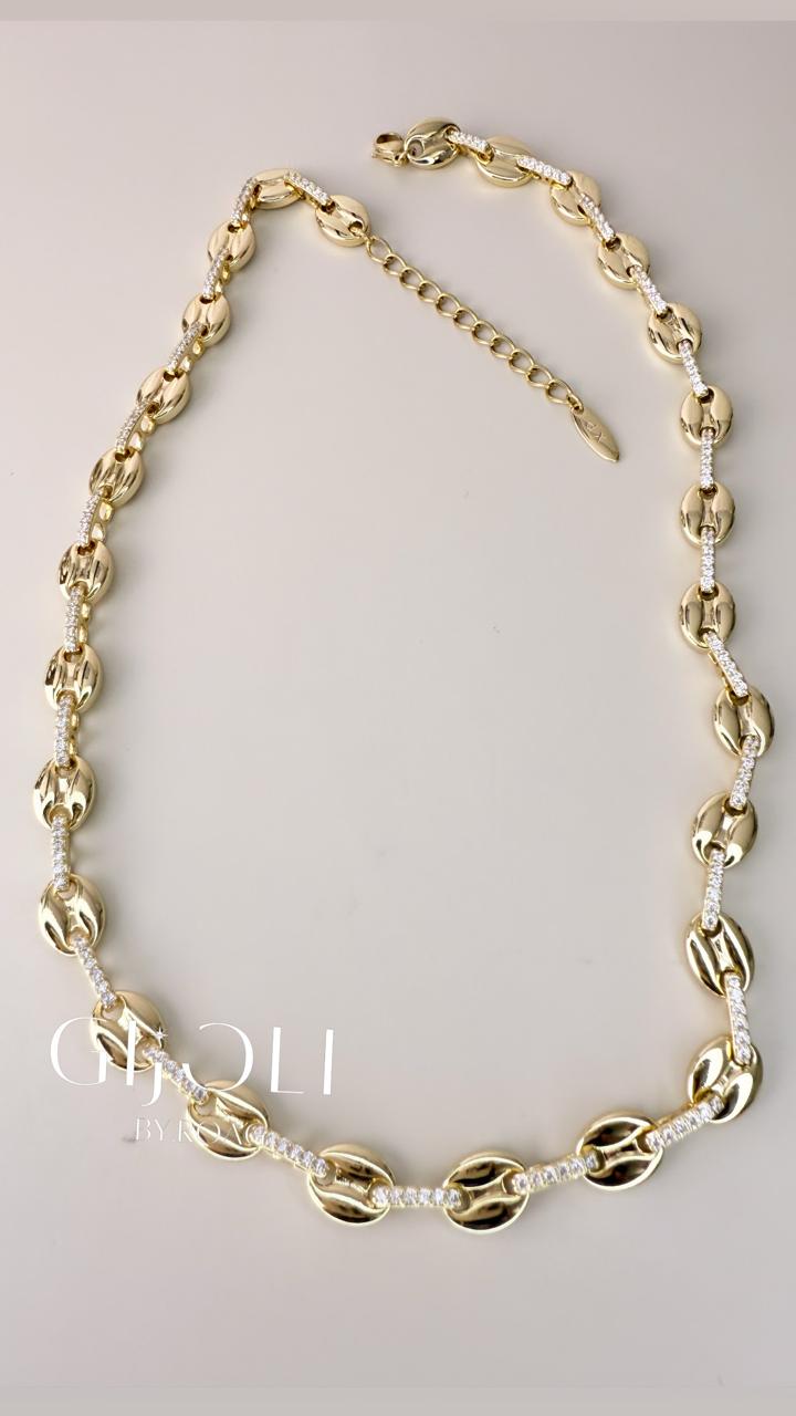 Presencia y estilo en una sola pieza. La cadena Roma mezcla eslabones dorados con toques de brillo para un acabado glamuroso y moderno.