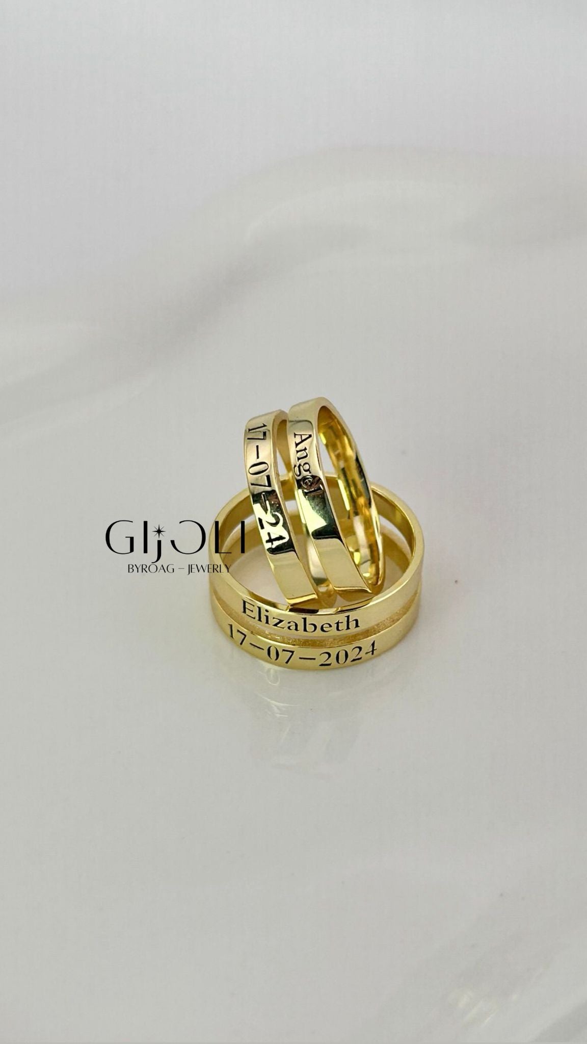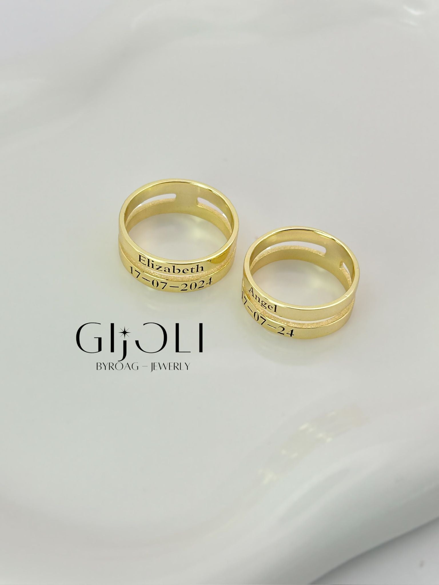 Un par de sortijas personalizadas para pareja con nombres y fechas especiales. Perfectas para celebrar el amor, la unión y esos momentos que merecen ser eternos. Graba tu historia y llévala contigo cada día.❤️