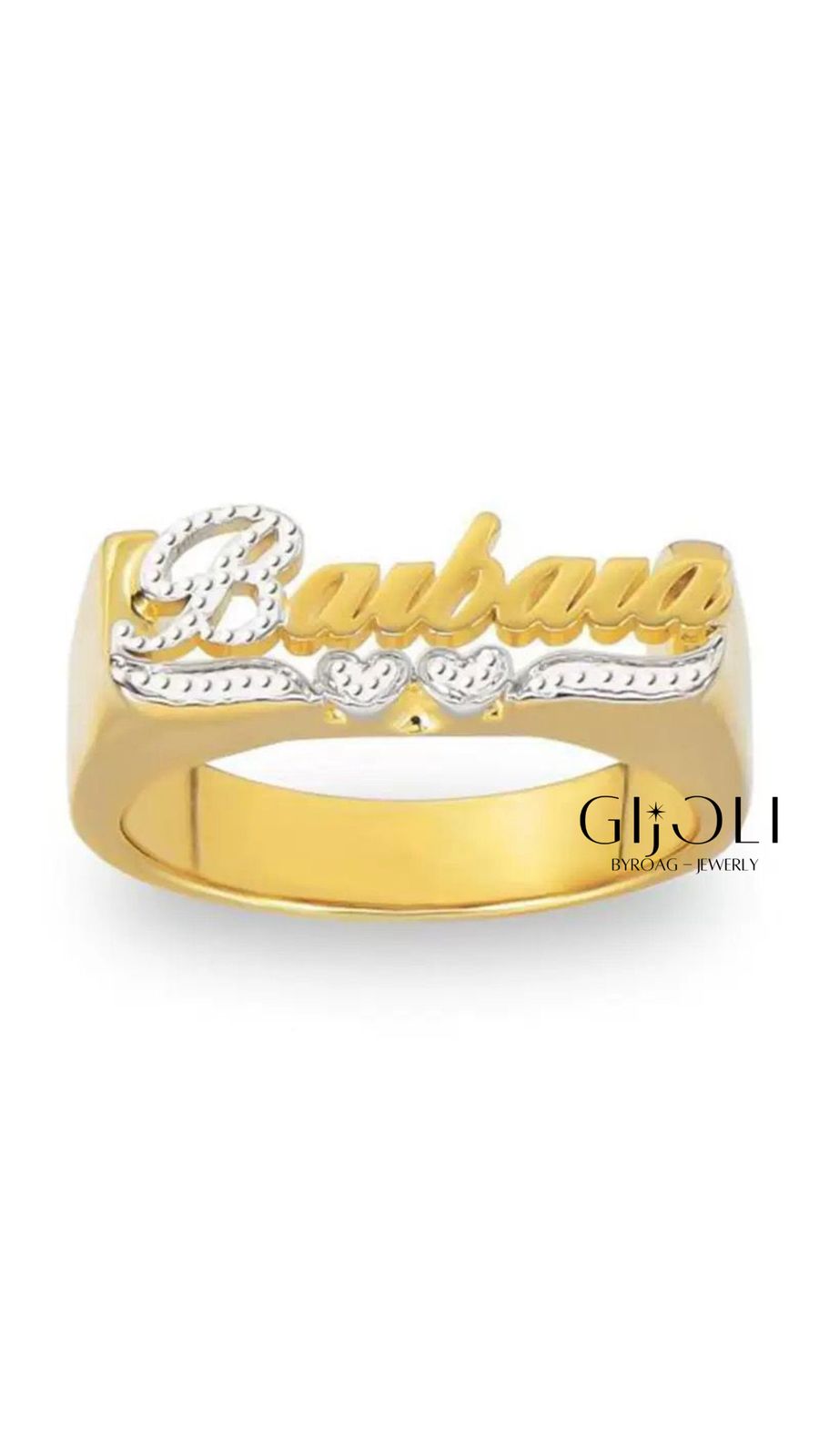 Resalta tu estilo con esta elegante sortija personalizada con nombre. Su diseño combina el brillo del oro amarillo con detalles en oro blanco, formando dos delicados corazones que simbolizan amor y unión.