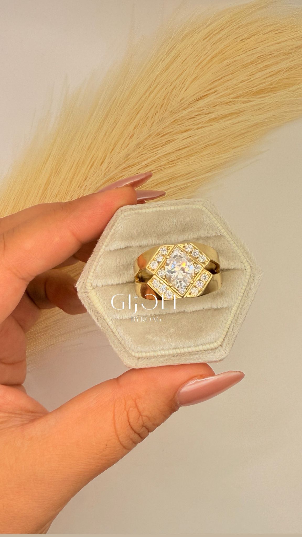 Sortija diseñada para quienes lideran con carácter y presencia. Su centro está dominado por una piedra, rodeada por un halo de brillantes que proyectan poder y distinción desde cada ángulo.